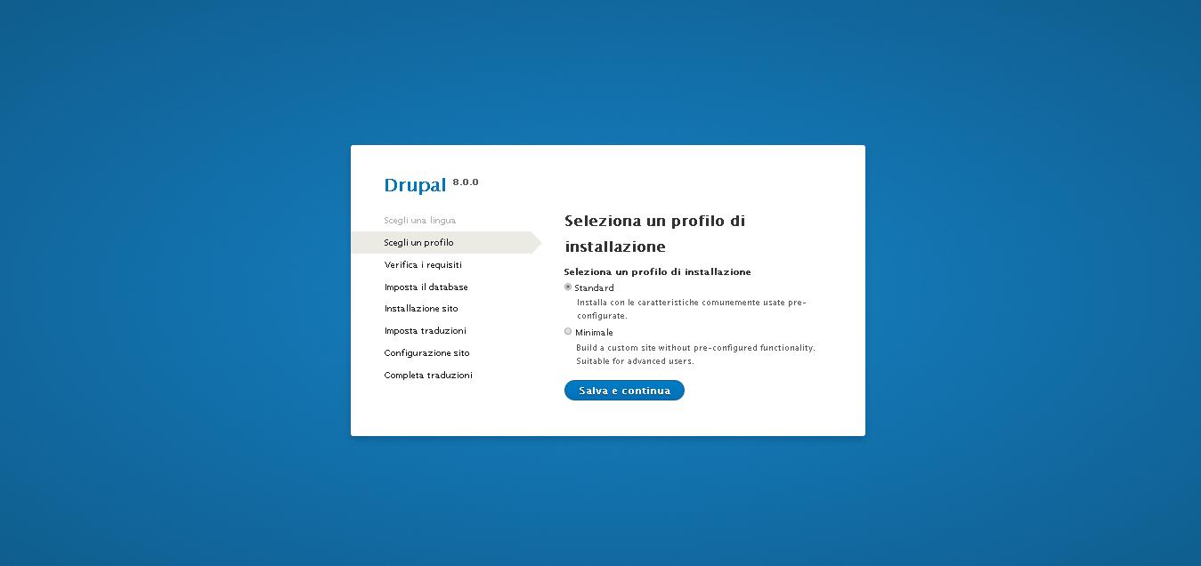 La prima cosa che domanda, finalmente, in quale lingua si vuole installare Drupal. Di default, nel mio caso è selezionata la lingua in italiano e presumo lo deduca dall’impostazione del mio browser.