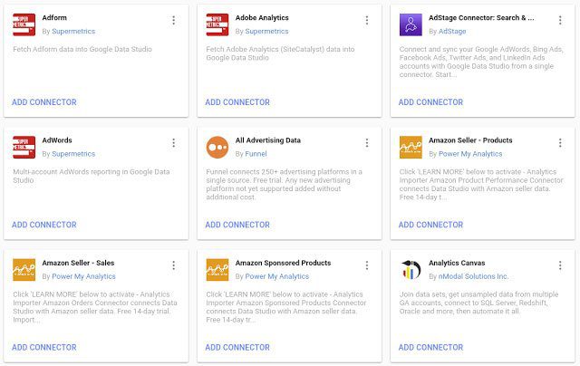 Dopo aver creato questo strumento, Google ha creato una comunità che come tutte le comunità utopiche che funzionano bene, serve a condividere le informazioni. Tra di esse esistono quelli che si chiamano connettori che non sono altro che le fonti da cui provengono i dati da utilizzare nei rapporti di GDS (Google Data Studio). Grazie a questa community, insomma, ogni giorno nuove fonti di dati (connettori) vengono create e messe a disposizione di tutti con lo scopo di creare rapporti sempre più precisi, funzionali e belli.