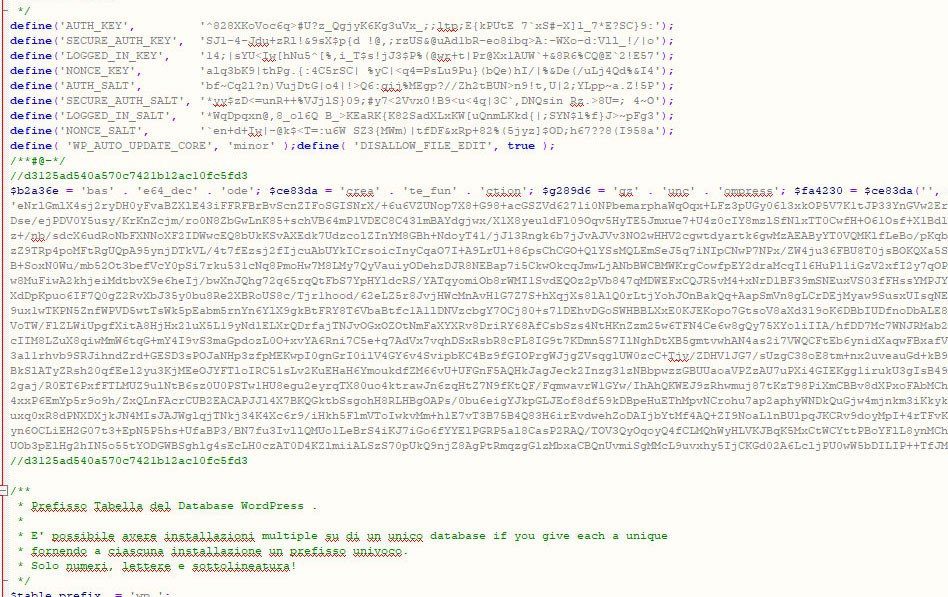 Chi ha un po’ di dimestichezza con WordPress riconosce che tutto quello che segue le chiavi di sicurezza non fa parte di codice del Cms ma è qualcosa di aggiunto e di malevolo.