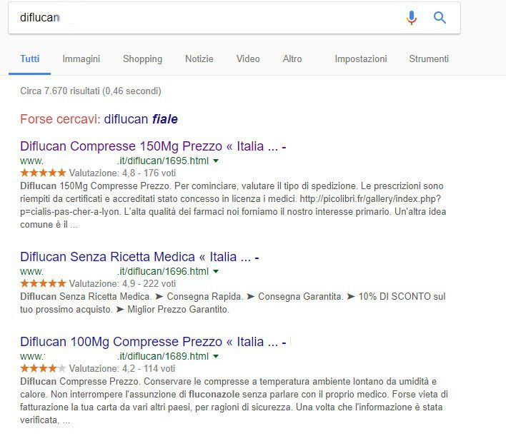Per esempio fai una ricerca con una parola chiave (che ovviamente non c’entra nulla con il core business del tuo sito e in questo caso era “diflucan”) seguito dal nome del tuo dominio e il risultato appare come l’immagine qui sopra?
