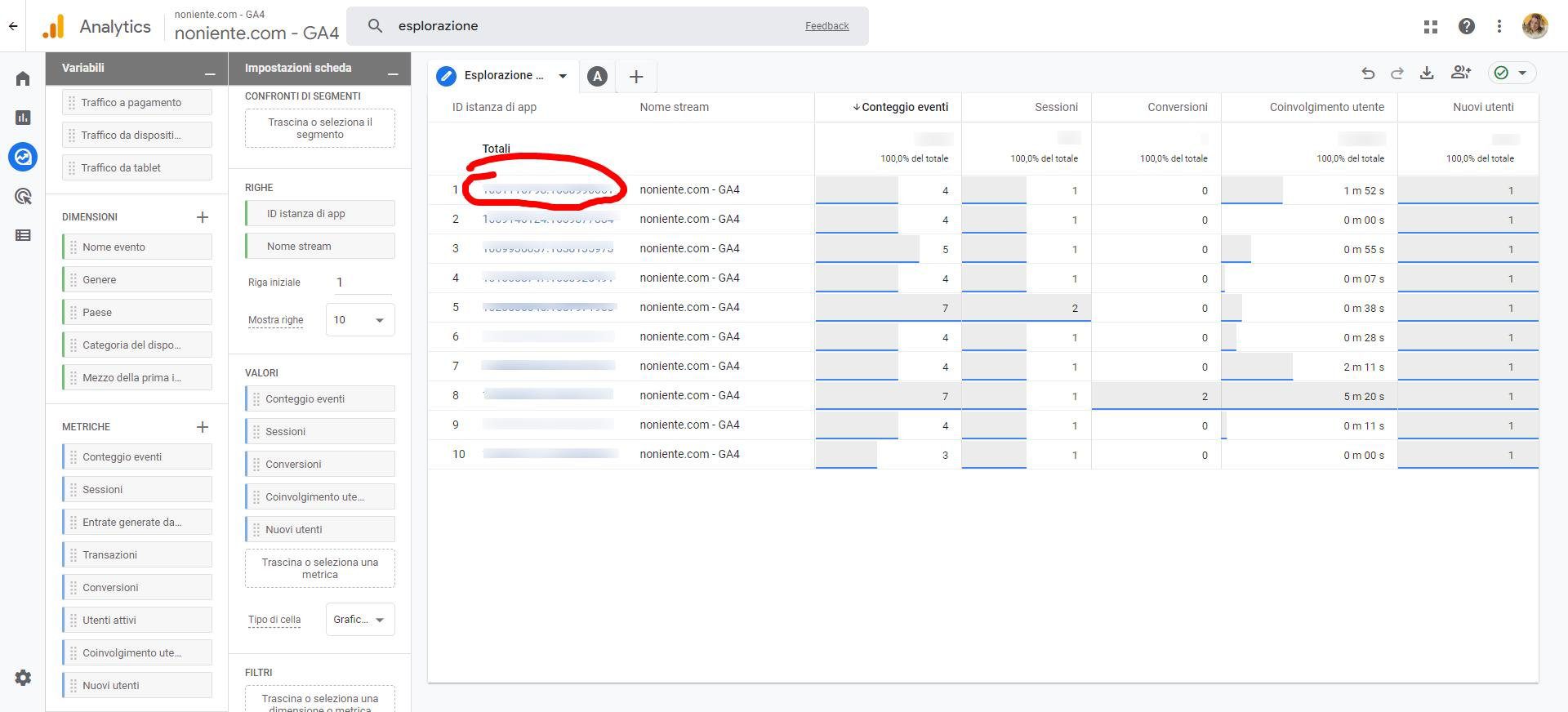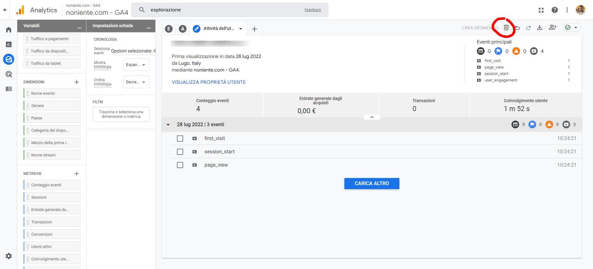 Vi apparirà una pagina di questo tipo in cui vengono riassunte le azioni effettuate dall’utente nel sito. Tramite l’icona cestino evidenziata potrete cancellare questo tracciamento da GA4.