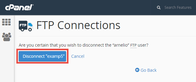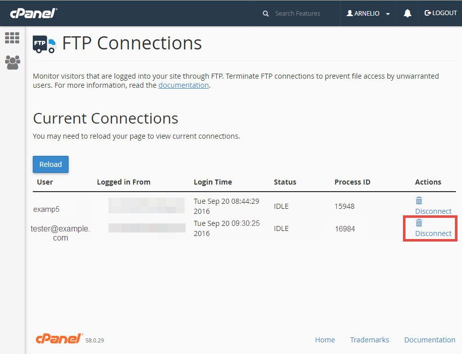 Quindi vedrai un elenco di tutte le connessioni FTP correnti. Fai click sul link Disconnetti nella colonna Azioni.