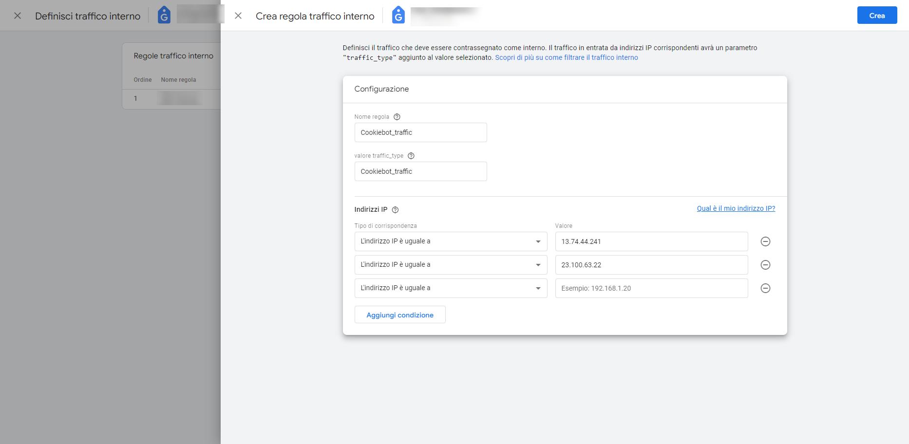 Selezionare Escludi per filtrare gli eventi in cui il valore del parametro corrisponde al nome immesso nel passaggio precedente. traffic_type Cookiebot_traffic