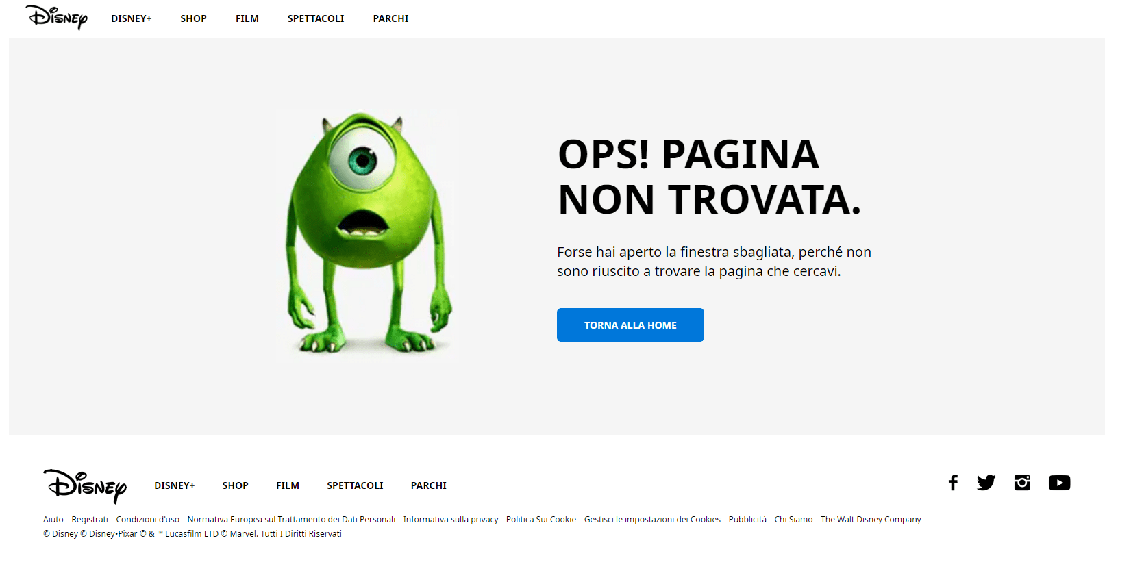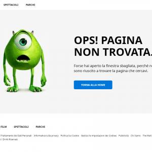 Punta sicuramente sulla simpatia usando uno dei suoi mostri per presentare la pagina non trovata. Però riporta tutti gli altri link per permettere all’utente di dirigersi in qualche altra stanza del sito.