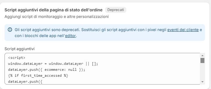 Di solito andavo in Impostazioni > Checkout per vedere gli script aggiuntivi della pagina di stato dell’ordine per controllare che tutti gli script fossero inseriti correttamente. Ma stavolta mi sono trovata davanti queste scritte che mi annunciavano che questo sistema era ormai deprecato.