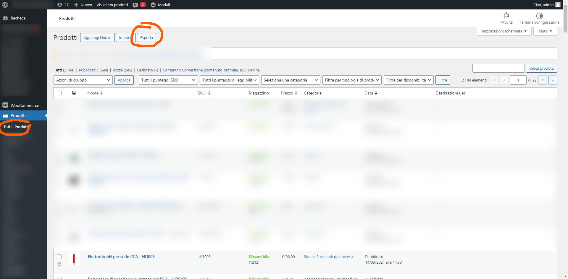 Una volta indicati i campi che si vogliono esportare e i tipi di prodotto che ci interessano questo sistema crea un CSV con tutti i prodotti presenti nel sito. Pubblicati e in bozza.
